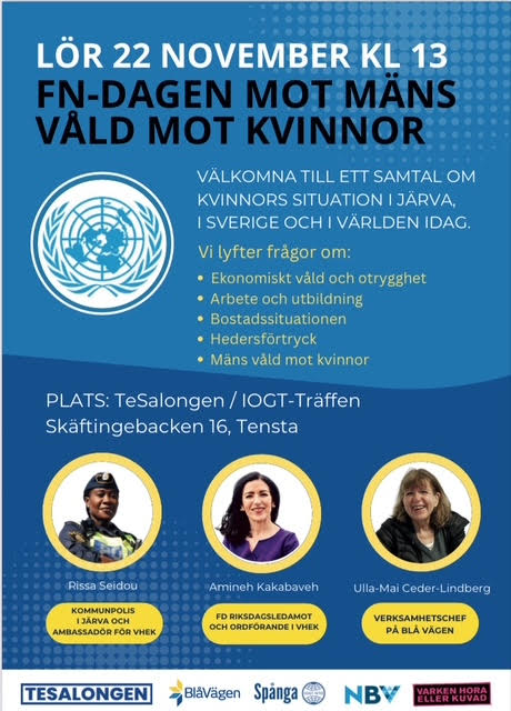 Inbjudande text: Välkomna till ett samtal om kvinnors situation i Järva, Sverige och världen idag, under FN-dagen mot mäns våld mot kvinnor. Vi lyfter viktiga frågor som ekonomiskt våld och otrygghet, arbete och utbildning, bostadssituationen, hedersförtryck, samt mäns våld mot kvinnor.